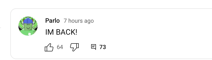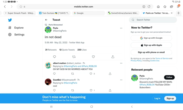 This Tweet received positive reception as a lot of his friends and fans were relieved to see that he was okay. It was later revealed by Nattie Forsyth that Parlo was grounded due to his parents thinking that his suicide attempt was caused by the internet. In June 30th, 2022, Parlo's main Twitter account @GamingParlo was suspended for unknown reasons. His other account @Parlo_ROBLOX was also deleted.