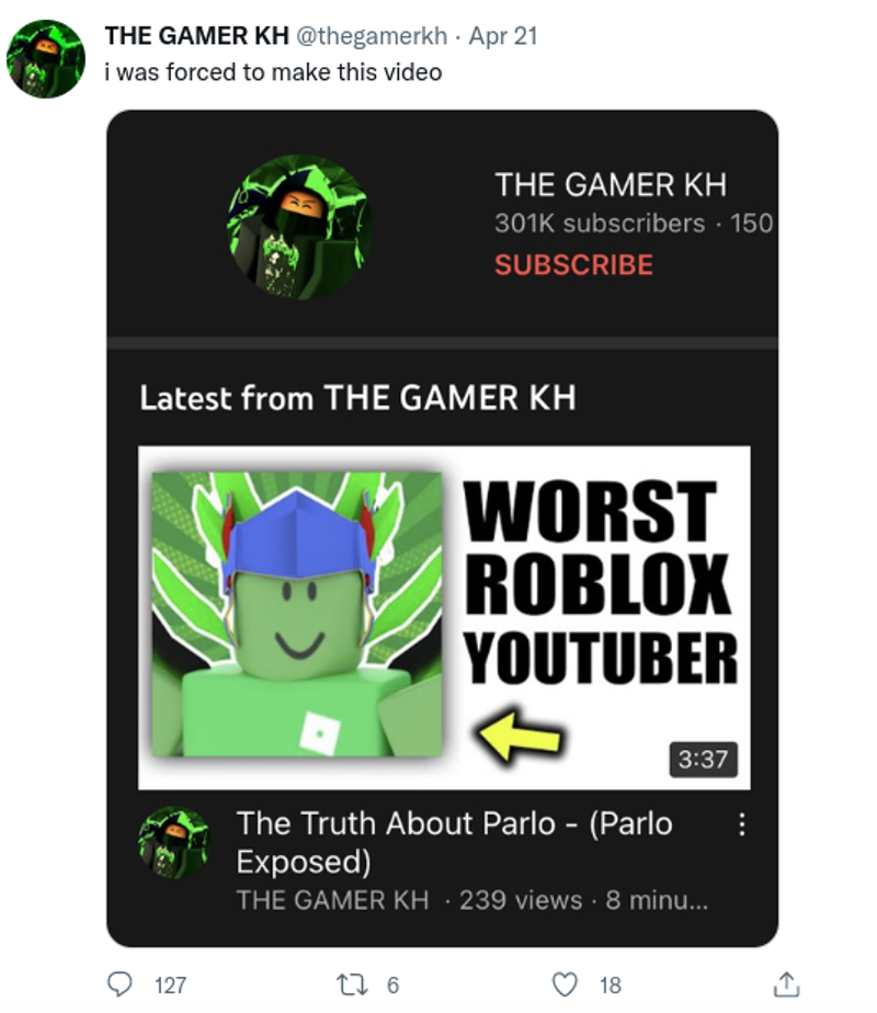 On May 1, 2022, Greenlegocats123 made a video titled "ROBLOX Parlo vs. Chaseroony "Clickbait" Drama"[18] (please note that the "drama" is in quotes due to how stuff is happening with Parlo at the time) about a controversy where Parlo made a tweet accusing Chaseroony (without mentioning his channel) for making clickbait thumbnails and fear-mongering. The tweet received criticism to the point where Kreekcraft and JOHN ROBLOX made tweets roasting him after Parlo made a tweet saying: